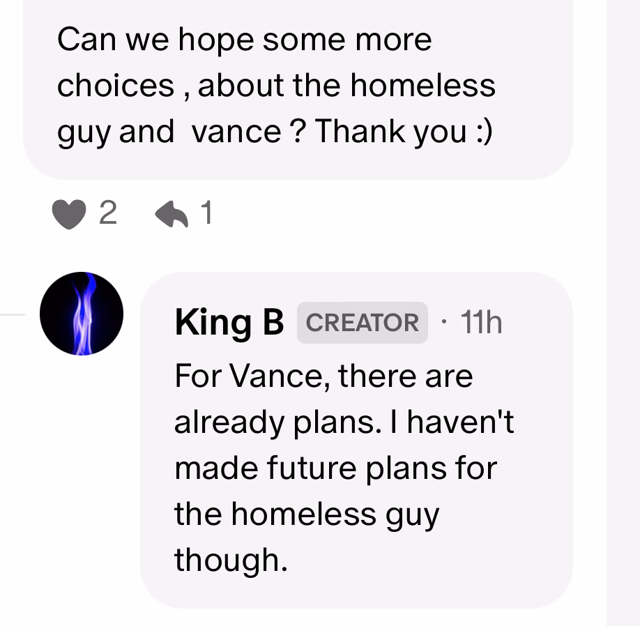 "...the couple learn that Vance is actually a truly an upstanding guy with a tortured past and take steps to help him under their nurturing wing?" Y'know to heal his wounded heart <3 , à la Carl-esque style, and to teach him to become a better man and grow as a person and step away from his past dark life with a full redemption arc. Ethan and Nat comes to care for him while Vance have a good, wholesome relationship with them, and looks up to Ethan as sort of a "big brother" figure and wants to emulate him so that he could live a more righteous life (and perhaps would do anything to protect the couple from other bad actors that's already in the game). Wouldn't that be an intersting twist by subverting many possible expectations folks had for Vance, the guy with a tortured past looking to redeem himself but never knowing how to go about it? :LOL: ;)