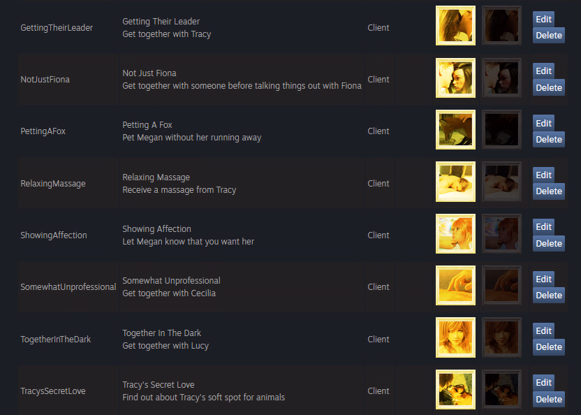 Speaking of Tracy, there is a secret scene between her and the MC which you could only get if you rejected Tracy a few times, and then told her in the kitchen at night that you do indeed have feelings for her. That allows you to get her in the shower the next time you train... It's pretty complicated and honestly, no longer all that relevant. Once again, you can now get this scene much more easily, as long as you are pursuing Tracy. It's a great scene, which ends with her telling you more about her thoughts, her feelings, her grief, and also the guilt she feels for running away with only nine people. Did I mention the sex? No? I would recomend you try to see this one. It's great.