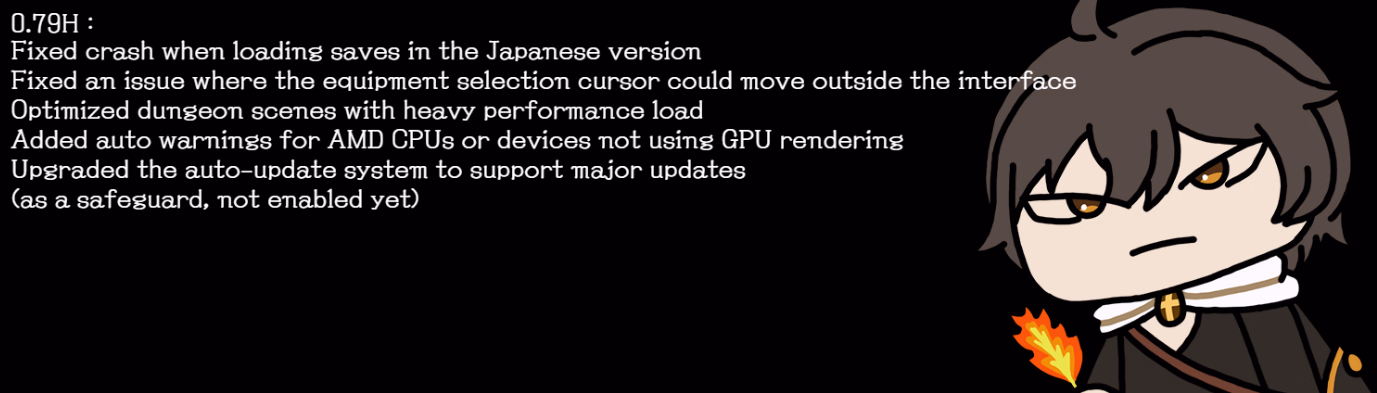 SadgeDue to the recent large-scale game takedowns on Itch, we has spent a considerable amount of time working on getting the game re-listed on Itch, which disrupted this month’s development schedule. As a result, we were unable to finish the planned content, and the update for version 0.8 will be delayed until around August 30. The focus of the update has also been shifted to implementing the “Imouto Cooking Event” and adding a new boss.