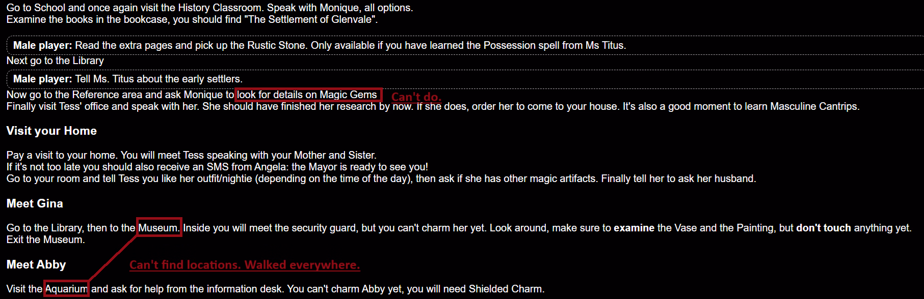 Monique will return to the library, talk to here there when she returns. Just meet with her at the school and the hotel if needed.The guide is terrible and has a lot of issues. At this step where we should ask Monique to look for details on magic gems, this step is impossible. In the earlier step where you are asked to talk all options with her the last step sends her to research a family so when you find her in the reference area you can't ask her to look for magic gems and if you don't send her to research the family then she's not in the research area but back in the school where you STILL can't ask her to research magic gems. And following that you are supposed to meet some girls at the "Museum" and at the "Aquarium" but as far as I can tell these locations just don't exist. I looked all over and couldn't find either. The "Museum" is supposed to be somewhere close to or connected to the Library but it isn't.