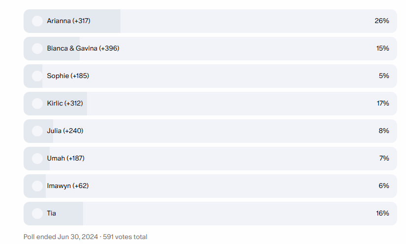 Umah, Imawyn and Sophie always get under 10%, Tia lost to everyone else on this list.