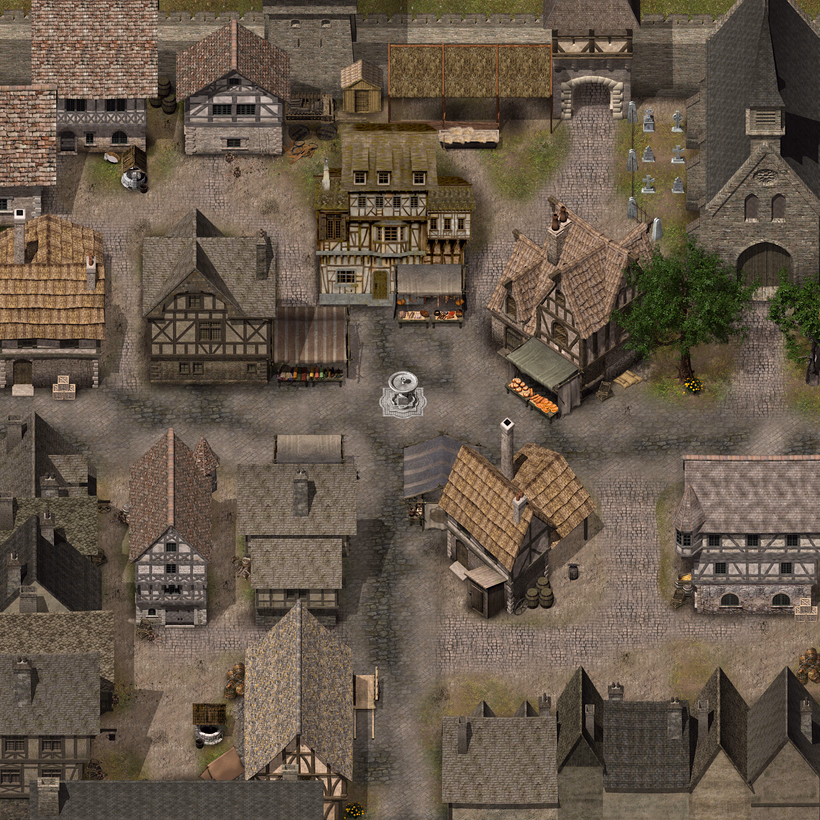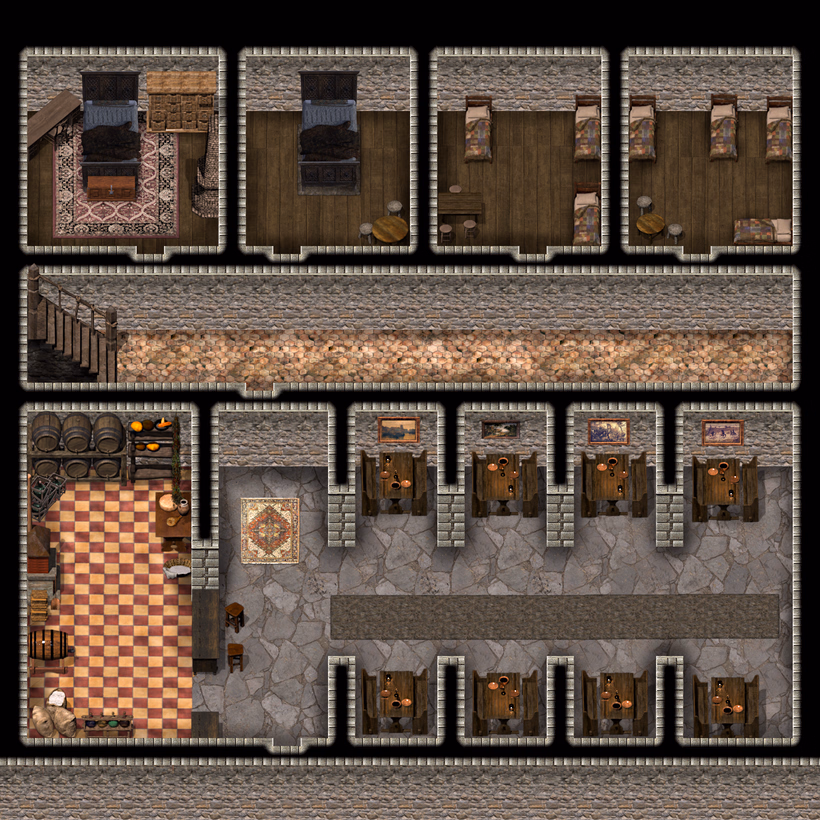 As you can see in the image, there will be a central square with market stalls and a few side streets. The main building at the city square will be the inn, The Golden Goose. I’ve also finished the map for it (there are some elements like doors and lights that aren't visible on this as those are added as objects in the game):