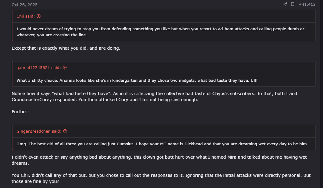 Just20 pointed out that a branch quest to infiltrate kirlic stays active despite them having no intentions on following through it and you derailed the discussion into the game having NTR. When I pointed out that netorase was introduced a couple of years into the development and that it doesn't mirror the sentiment of the dev, evident by the warning wording that remains unchanged from said time, you ignored it and doubled down on how the ability to turn ntr off is not meant to turn the game easy despite no one defending that argument.