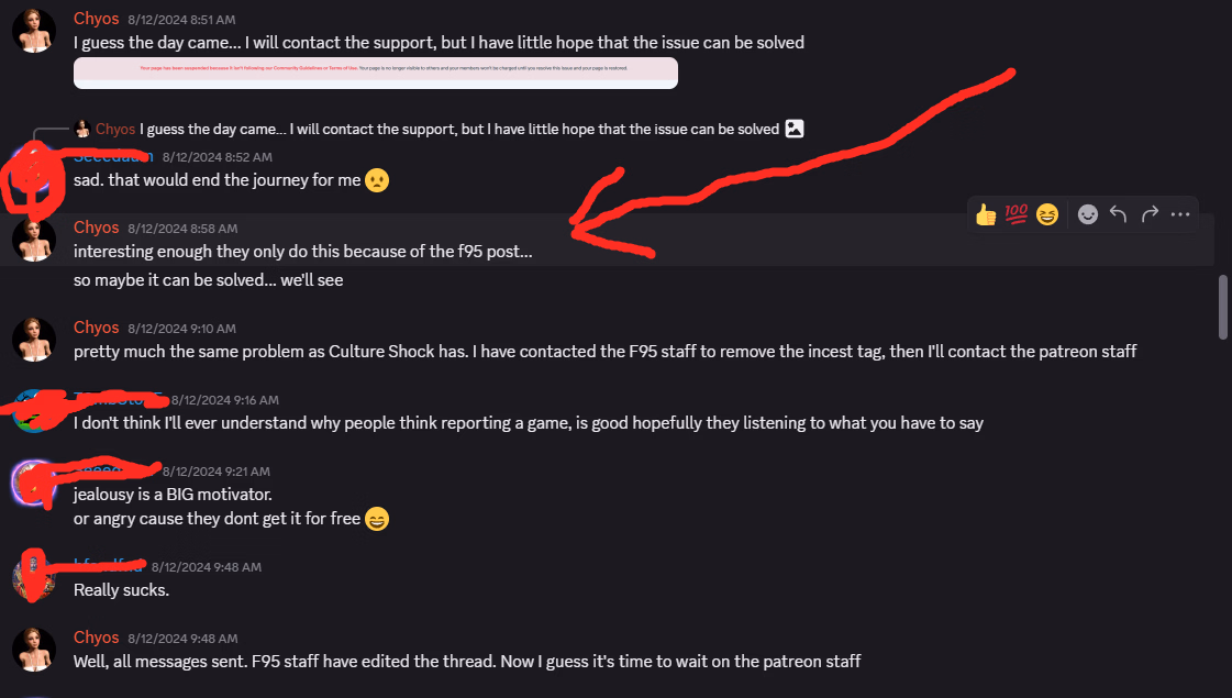 I can't double check this since I lost my supporter privileges, but it really does not matter what reason Patreon gave Chyos, since my point is that f95 contains so much content unrelated to the devs of the games here, that they would be crazy to distribute punishments to their revenue generating userbase on such shaky evidence, as they would lose a lot of creators that way.