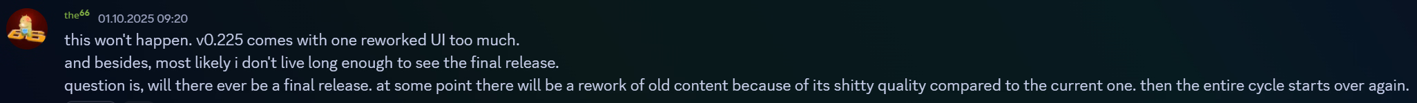 Good update or not, good game or not, its years in the making (8 years by now) with little to show for it. This is probably the general consensus on this forum, that from just a cursory glance. AVN with loads of potential, but instead of pushing and creating content, respecting the subscriber and support, you get these developers that have no reservations about keeping the feeding trough stocked so they can eat for as long as the sheeple keep supporting. Money for nothing...ttsk, shame on the developer and shame on supporters that blindly keep propping these charlatans up!