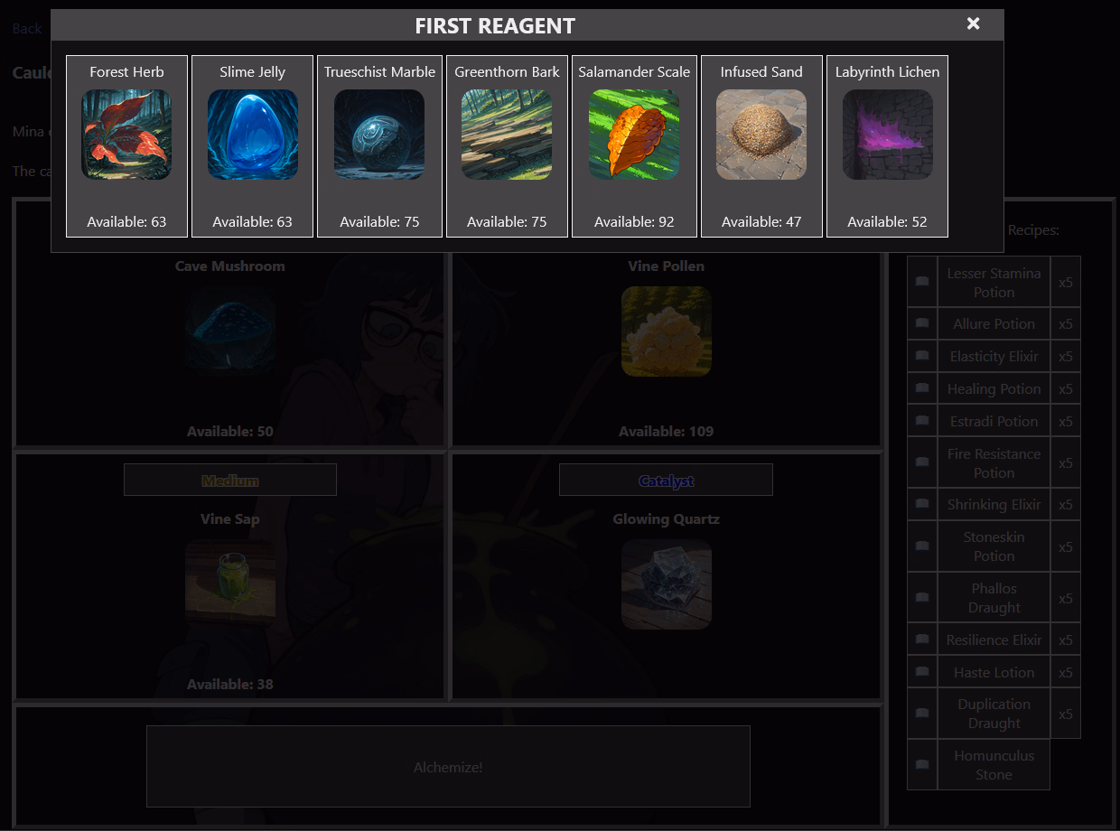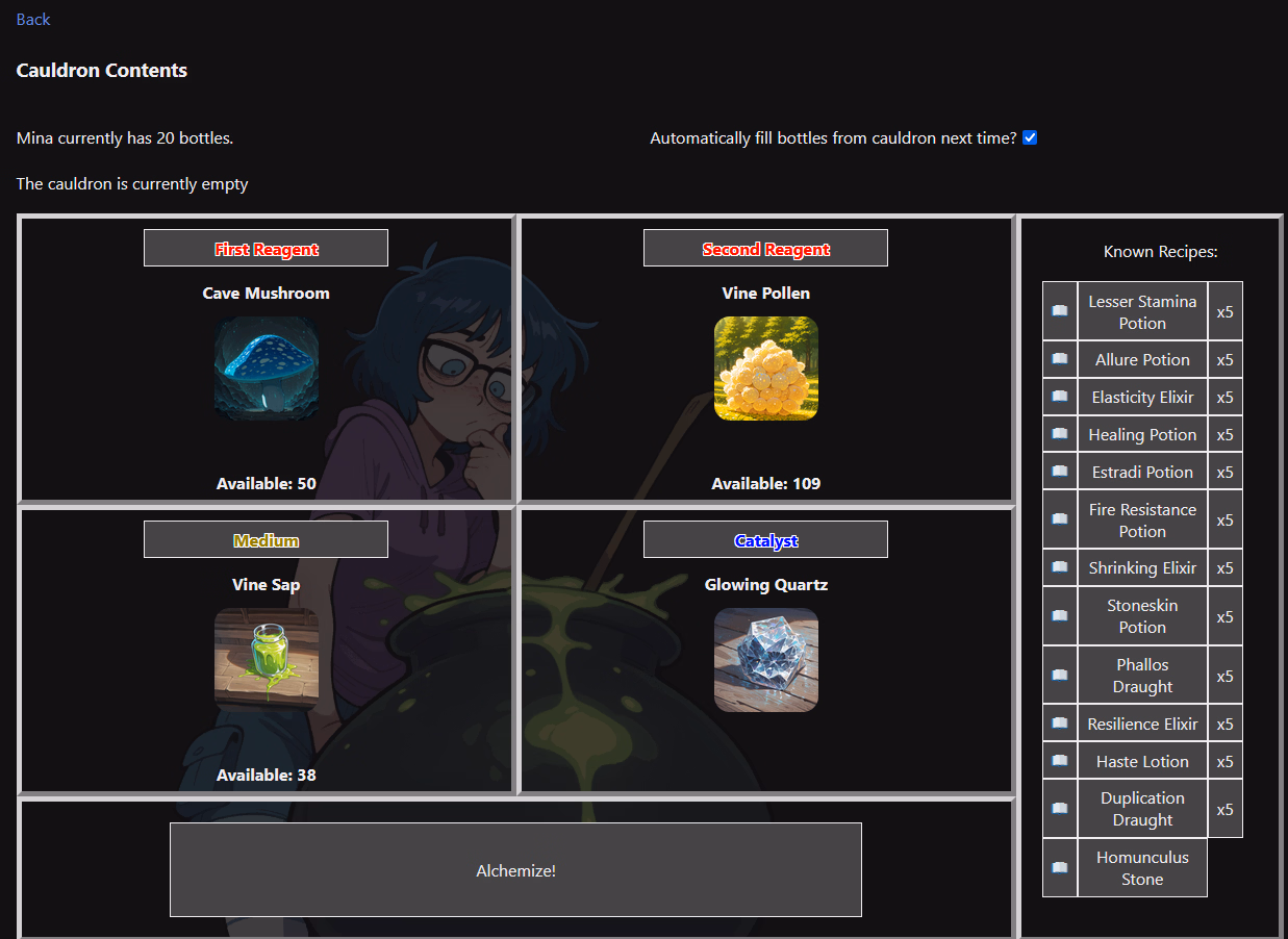 • The other big change to the Homuncuties is the process of creating them. I've taken out the whole unintuitive "make potion and then use certain item while potion is still in the cauldron" thing. Instead you'll now have to get a specialized catalyst, the same way you get the other catalysts, to make Alluring Base. Journal has been changed to reflect this. From there everything is the same.