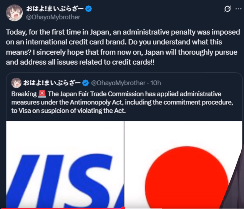 I've read somewhat conflicting information on this. Some are excited they're "fighting back" but other Japanese netizens point out that they aren't actually enacting any fines or punishments on them that you would expect with the Japanese anti-monopoly laws. Instead, VISA agrees to go back to what they were before the changes they made, with a third party monitor over the next 5 years. In short, they found they "technically" didn't violate the law (even though they kinda did) and essentially got away with it by saying "We promise we totally won't do it again."