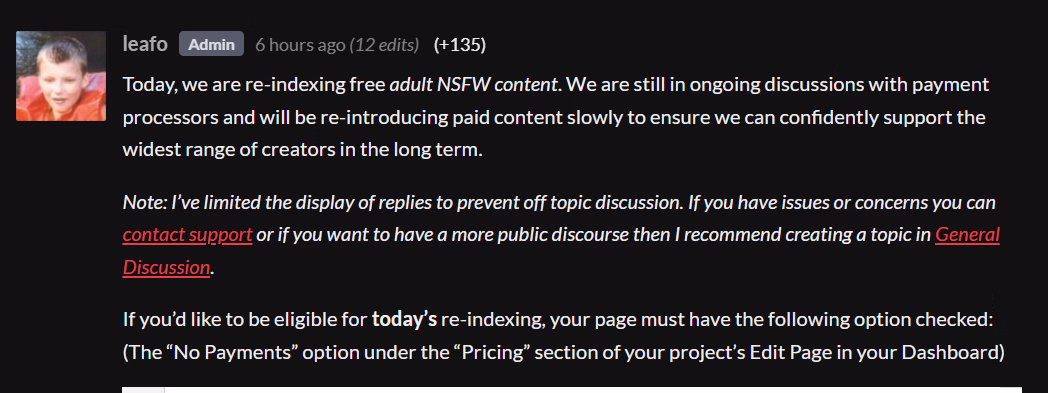 Maybe they can change their adult content policy then too. It reads like totally vanilla missonary or bust, just like Patreon. They didn't enforce it(or very little) before the shouting Cunts had a fit though. Maybe that can change with better payment processors.