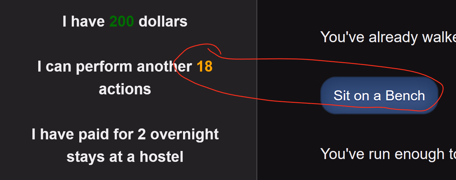 Yeah, looks like I forgot to add a safe word for it, eh...FYI, the park bench is probably bugged. You can sit on it at noon as many times as you want, getting action points in abundance.