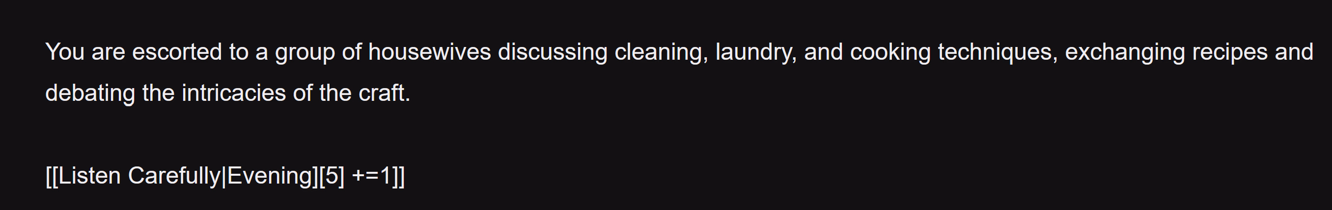 Damn, this started to annoy me when I was testing the update. It was originally planned that way, but then I ran into a problem with time tracking and cycles. How do I give players the option to "continue" their morning after waking up in the hostel? Or give them the option to "return to the city" at any time of their choosing? That's pure abuse. That's how waking up in the morning and having to return to the hostel came about. Should I not charge AP for that? That's also abuse. Should I give them one extra AP in the morning? Well... anyway, I got to the current version and calmed down.Here is a personal peeve of mine.