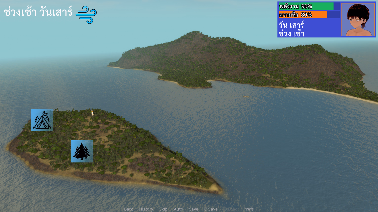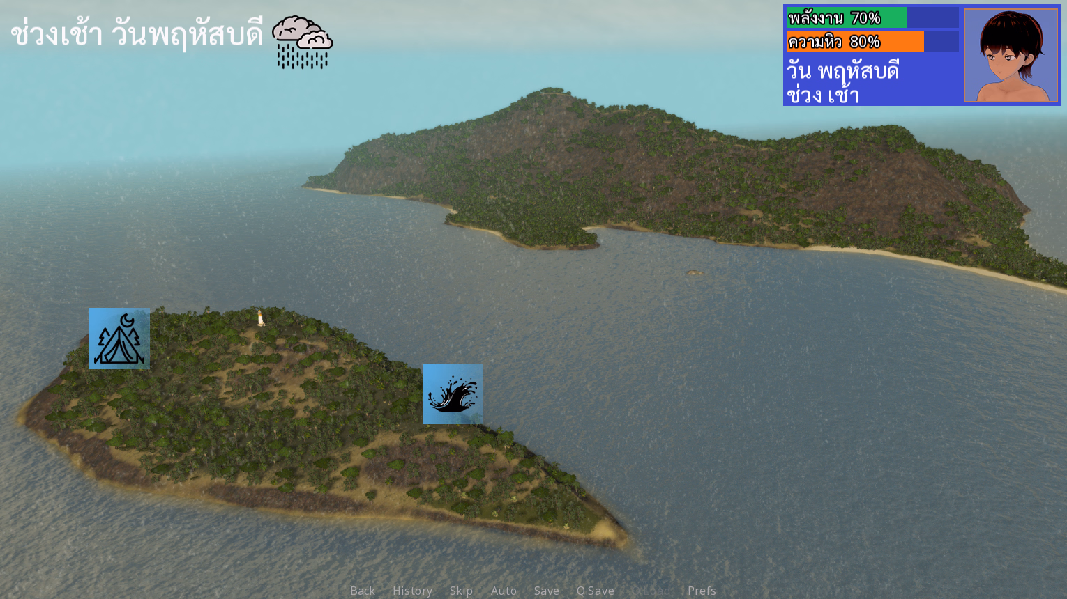 Weather: clear / rainy season (random) that affects activities.