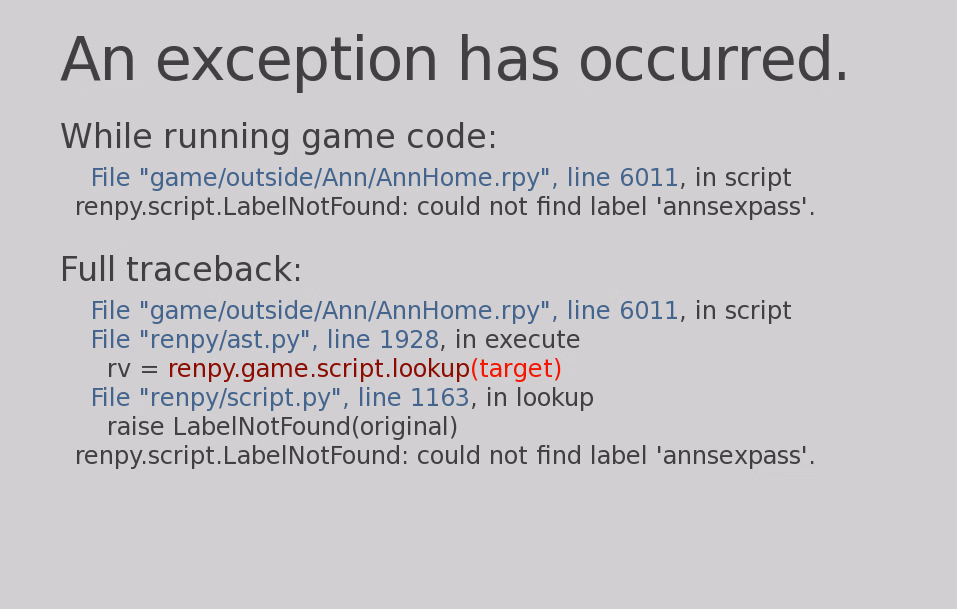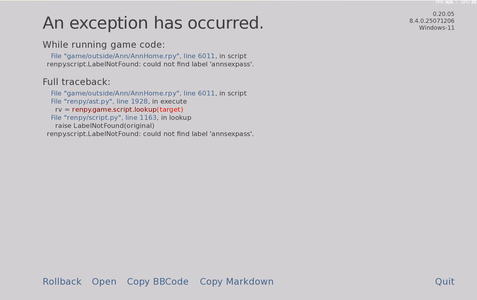garbage in general, and since all of ai cg is just regurgitated slop of actual artists' styles, you can already have your wish.Most likely dev used AI to code. AI coding gives a lot of error which devs(since they didn't really go through the code) don't know how to fix.I think from here on out, dev forgot to add the said lines or rpyc files that should be called in scripts lol