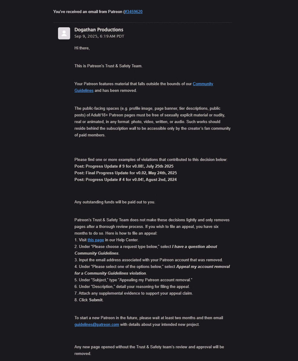 Dogathan Productions hope you can get a Subscribestar page.Hey everybody! Some really bad news today unfortunately... Patreon has shut down my page and deactivated my account entirely. I think amidst the latest crackdowns on any form of adult content, they reached pretty far back into my post history to justify the banning as you see in the screenshot below. Seems like they are cracking down really hard on adult content, which came out of the blue. They have let me know before if my posts were adult in nature, and I shifted them to paid members only, which would solve the issue once and for all. I'm not sure what possessed them this time around to not even provide me a warning and suspend me entirely. This is a huge bummer, as subscribestar still hasn't replied to me, despite all the times I have reached out to them, so I don't have any means of generating support for this game at the moment. I'm not really sure what my next steps are, but I will have to take a long break from the game to see if there is a way to appeal this or if there is another payment platform I can use in the meantime. I am really sorry to all of those of you pledged money, and I have no way of even confirming that Patreon refunded you any of the money you put in for this month. I don't have access to my account, so I have no way of knowing what happened, since they sent my $8 as my remainder for the month and called it for the day. If you were actively subscribed, I highly suggest you look into getting the amount charged back on your credit card if you can. I'm sorry this happened y'all... I'm really thankful for all the support over the last 2 years, and I really wish it didn't have to end this way.