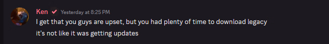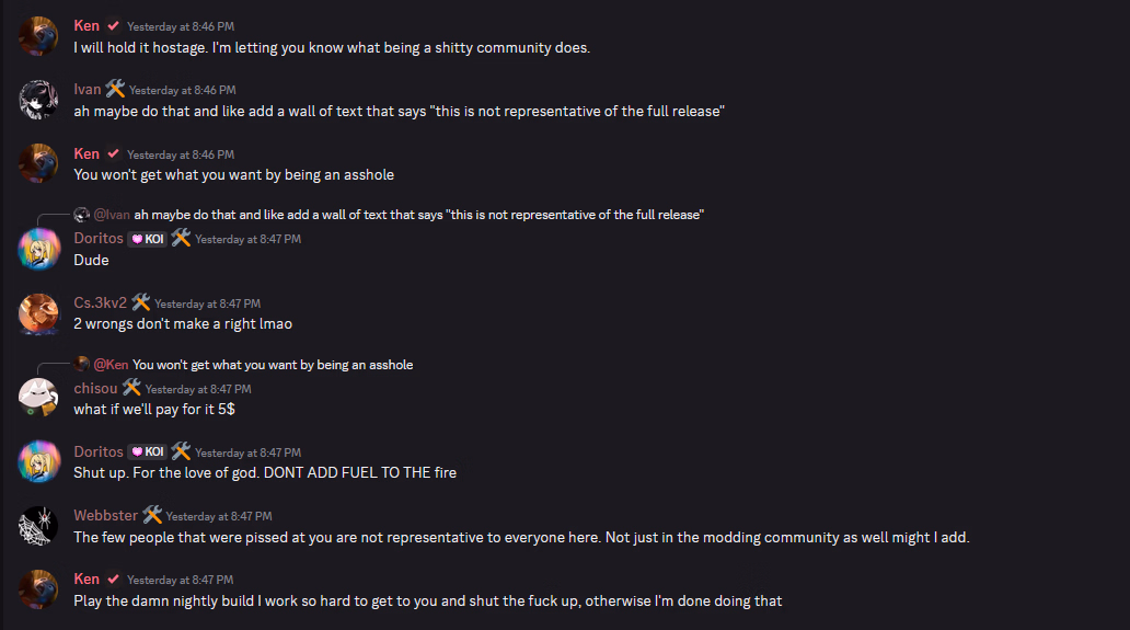 For all the slack I cut him for actually reasonable reasons, he does need to check his soft ego. If he can't learn to take criticism or learn from feedback, or even at least try to understand backlash, he's not going to make it as a dev in the long run. This isn't the first time he's given the empty threat to cancel the thing when he got sour. Good leadership requires a cooler head.Here's some highlights