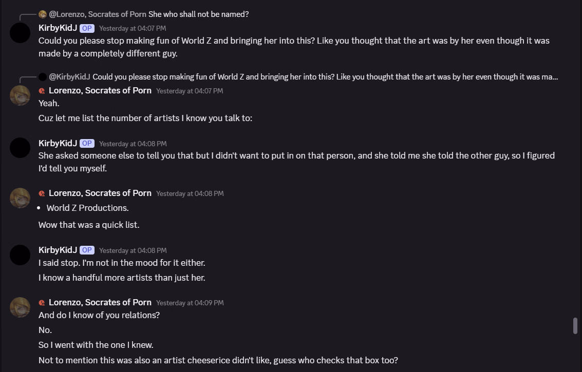 Then he lashed out at a member, who hasn't liked World-Z for a long time, cause apprently, World-Z asked some people in the server to tell that person to stop. They had a back and forth argument, that led to Kirby getting VERY depressed. As a result, the member who argued with him got muted for I think a day. But, it is unknown what happened after this... It's assumed something happened outside the server, maybe dm's, but somehow Kirby broke guidelines and can no longer be in the server.