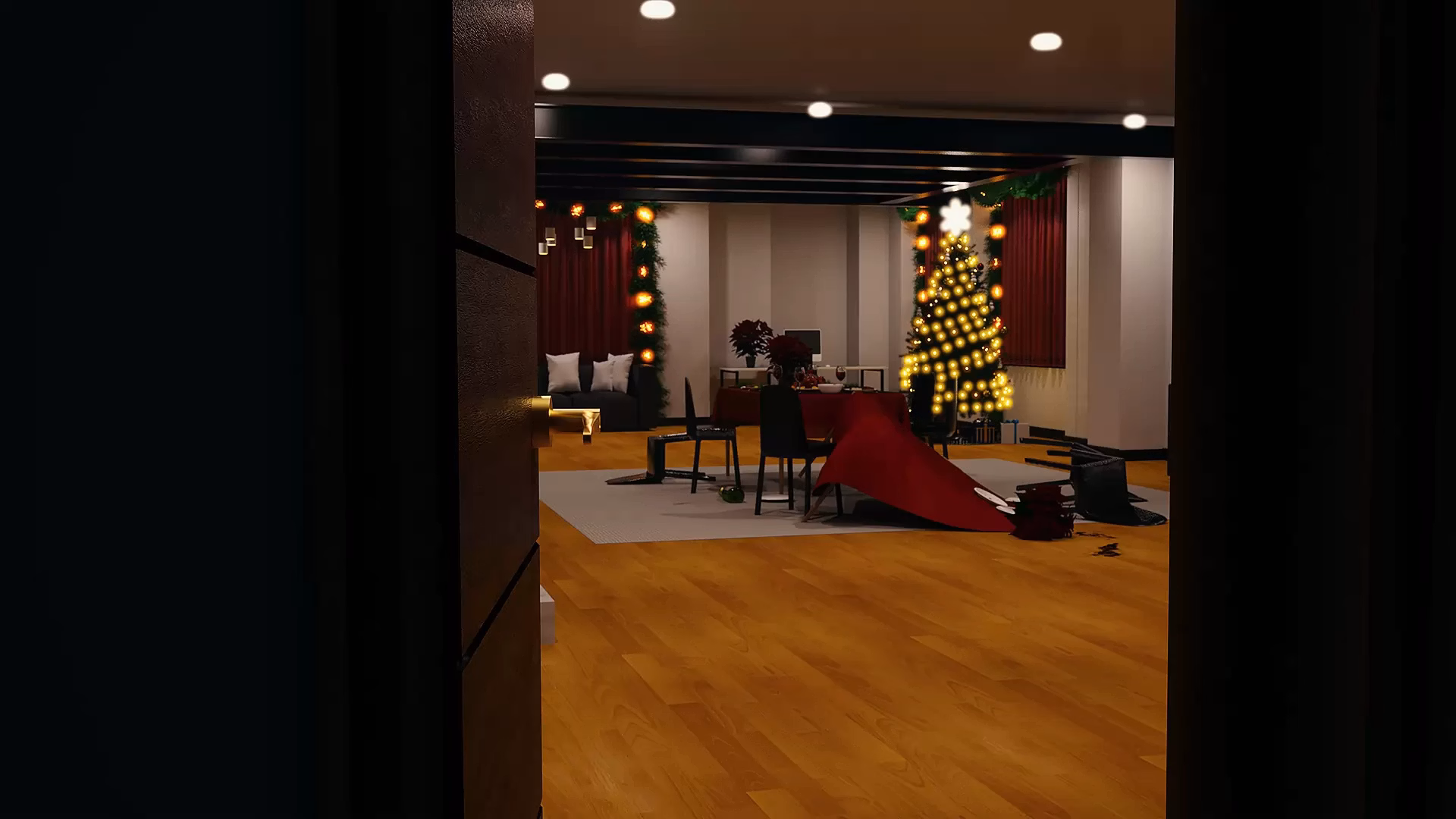 This is the view from inside the room before the shadowy figure appears. This cannot be the bathroom that's being exited, the bathroom is in the middle of the three doors. Plus it would make no thematic or even contextual sense for it to be the bathroom.