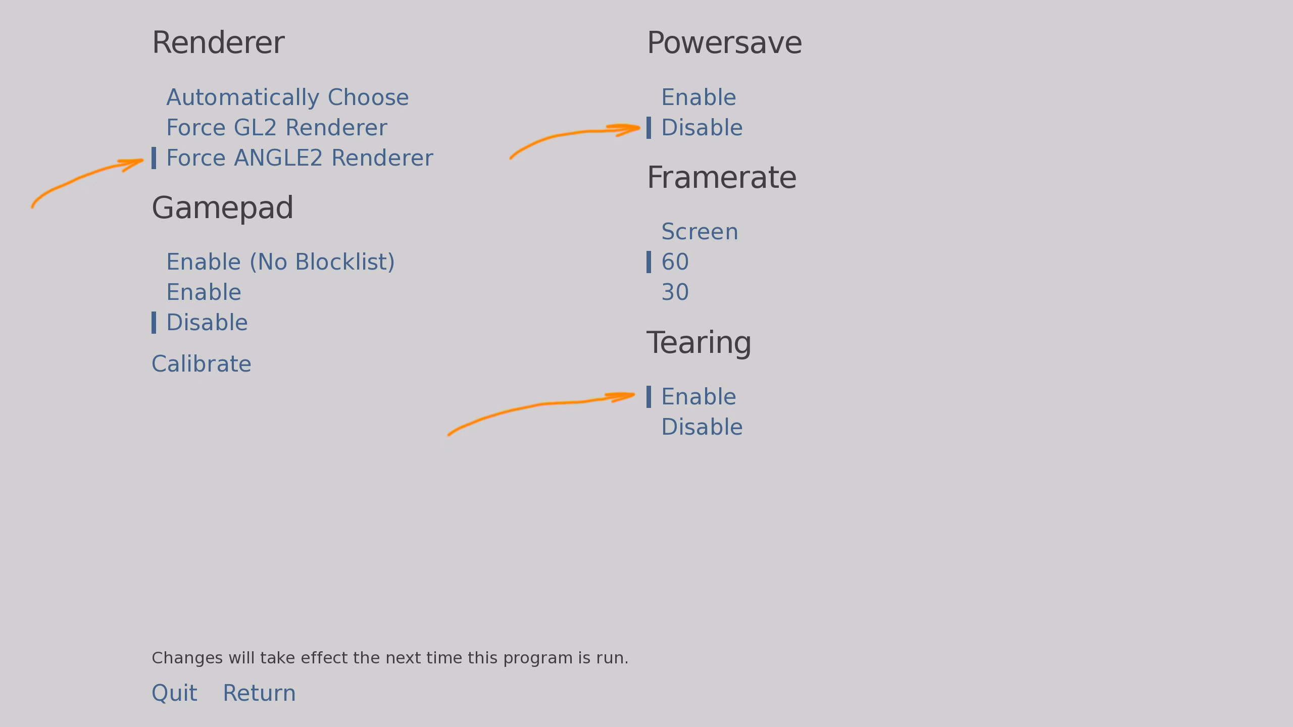 Apply and restart. All should work fine now and w/o jitter, freezes and lags. With default settings lags occur even on quite top hardware like good CPU + RTX 4080. The main reason is "powersave" setting. But ANGLE2 renderer is also more stable and works better.