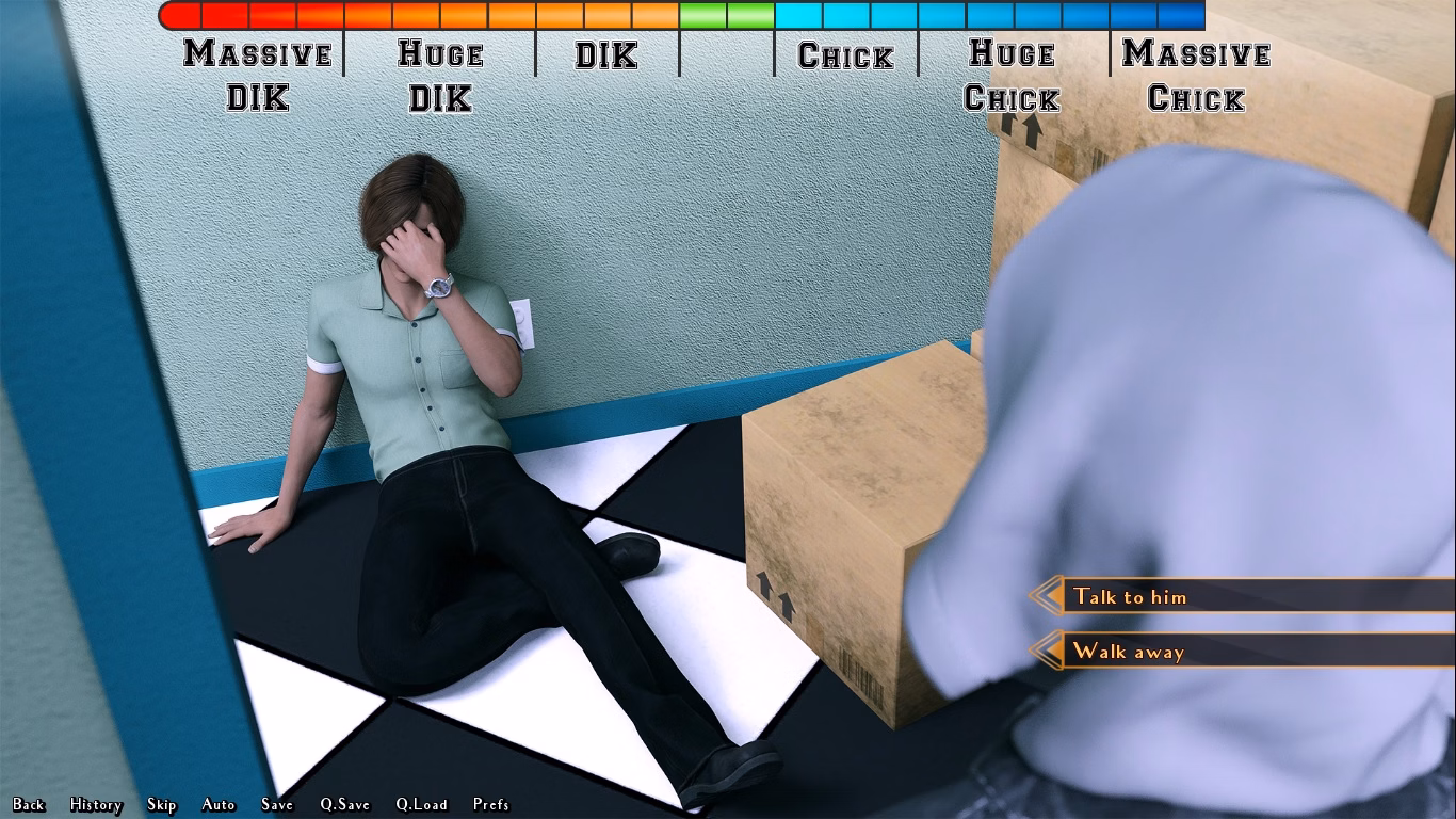 I like how in this game some simple choices actually affect your MC’s stats (even though they probably shouldn’t, I think). For example, if you choose to support him here, the game literally takes away a bit of your DIK affinity. So just by trying to stay human and show some empathy, you lose the chance to be a massive DIK. It doesn’t really make much sense and doesn’t affect the rest of the story much, but there’s something about it that hits different.