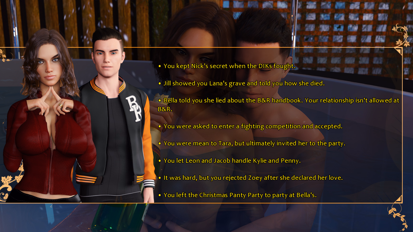 My main is Bella, kiss Jill and banged Jade. I always try to make the most scumiest playthroughs possible.