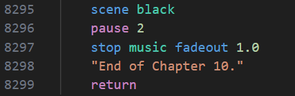 Why has it taken so long? Well I mentioned this over the last few updates. The Christmas period and other family commitments, certainly effected my ability to be able to dedicate the time I needed to. But so too has been the size of the chapter. When I started out this one was supposed to be the start of 3 final short chapters to close out the game. I still want chapter 11 and 12 to be like that however chapter 10 is the largest chapter in the game but some distance. Standing at 1,154 renders in length (almost double of most other chapters) and will be well over 9,000 lines of code when I'm done. Here's proof of where I am at the moment with 3 scenes to go