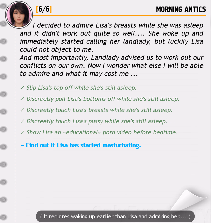 The last task opened is "Find out if Lisa has started masturbating". I tried everything a lot of times. Touch her pussy, directly of after removing the bottom. I have been caught a lot of times and then apololgized a lot of time with candies. Also did it a lot of times without beeing caught. Every time I go to the bathroom after at 7am and use the ladder, then I watch her on camera, but nothing happens. Any idea ??