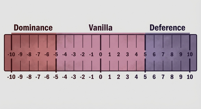To go back to the Molly and Josh dominance/deference example, we start the game with Molly and Josh in a loving relationship with equal power in the bedroom. We’ll model that with a score on this tracker of 0.