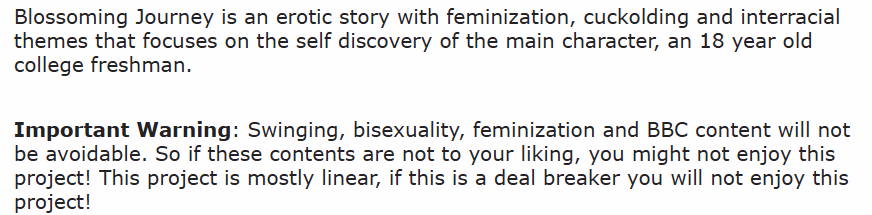 I have asked the moderators here to do these things but I have no control over this page. I apologize if this website's tags misguided you into suffering Blossoming Journey.Not a huge fan of being given multiple choices with little difference, there is a difference between unavoidable content and outright linear content. Add "this game is linear" at the unavoidable warning so people don’t feel mislead otherwise it’s obviously going to disappoint some expecting a game