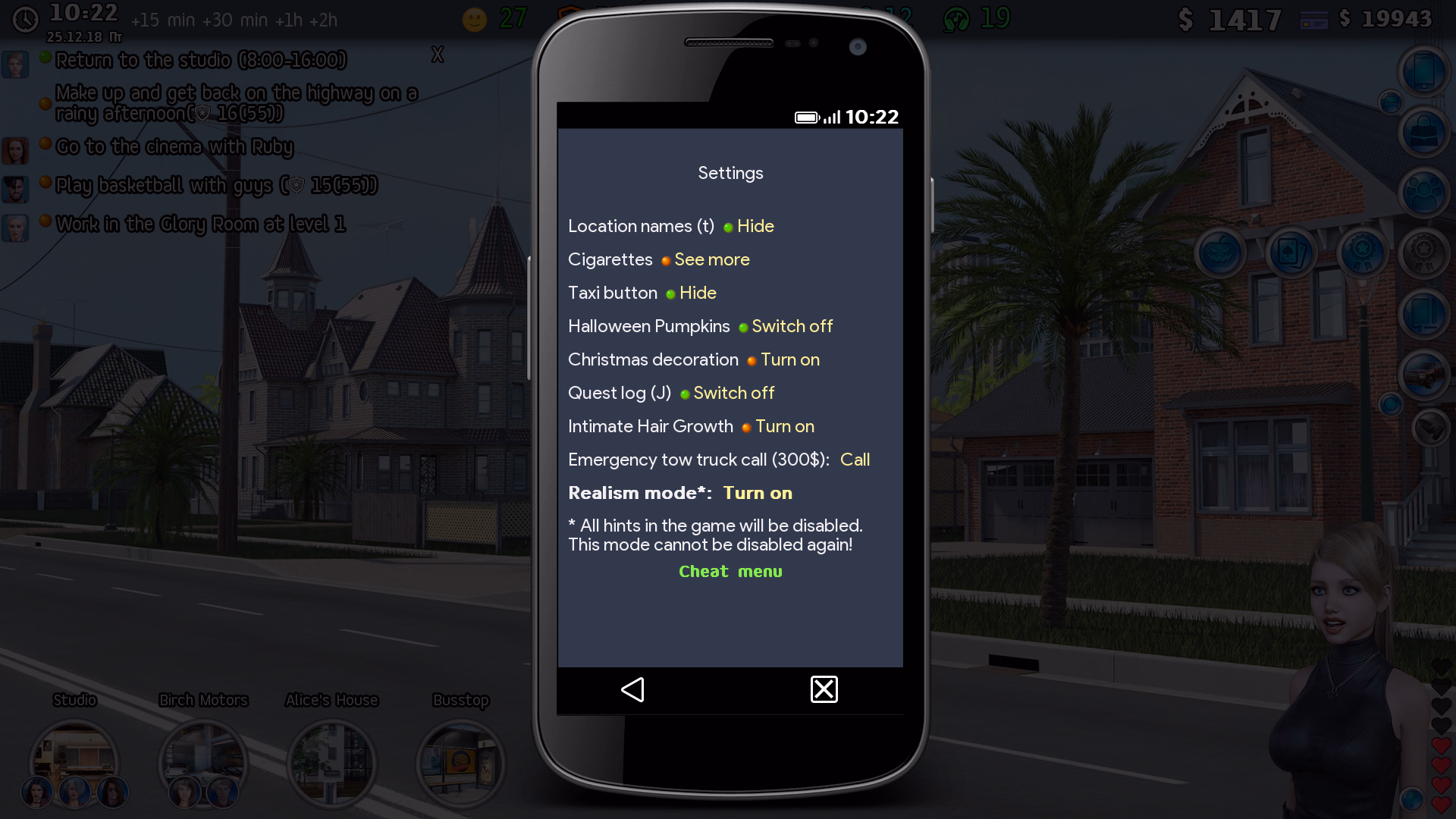 In addition, if you don't like sandboxes, you can make your heroine's life much easier. Go to the smartphone menu (at the far right of the screen), and then in the settings you will find a cheat menu where you can, for example, add money and excitement to Alex.
