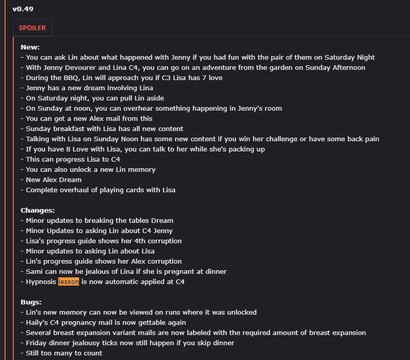 Thanks for pointing that out, but I am not sure if it's a bug in my game or a miss/bug introduced in the new version. Since for Lisa, it doesn't activate, but for Jenny, it works when I checked just now. There is even a note in the guide that hypnosis lessons or C4 work with Jenny. But again it doesn't work for the Lisa part for me and it's not noted that C4 should work in the guide either. But yeah I got over 90% of the stuff unlocked and found, I am just missing a bunch of mails and a few of the scenes for some characters, so I'll just wait a few versions and try again. Thanks for the help though.it's not very clear in-game but should be at C4