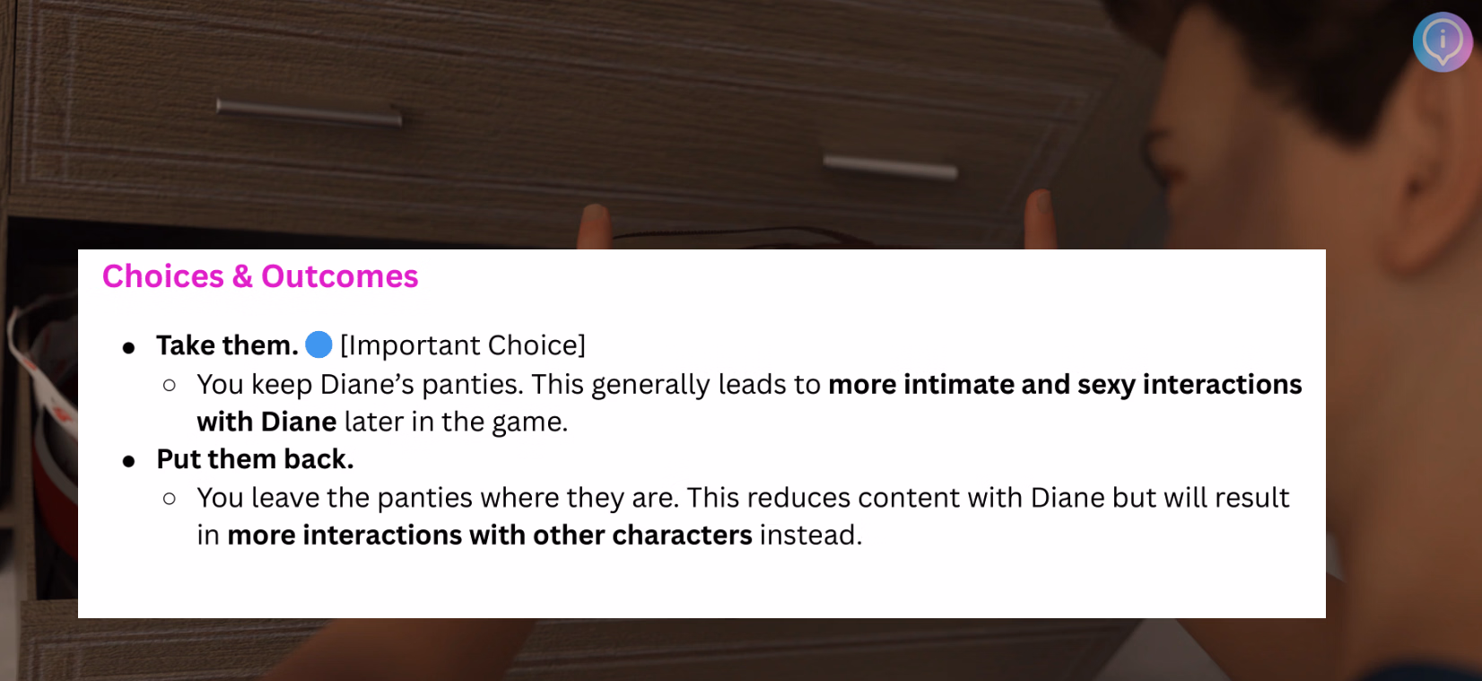 For these key choices there is an icon top right with a small info box explaining the consequences, eg taking Diane's panties starts Diane's path which will block certain events with other characters like the bar scene with Becky and Lara.
