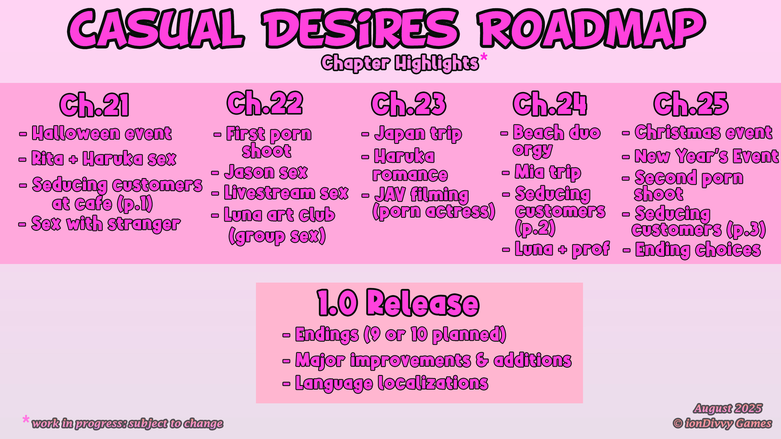 Seeing the roadmap has made me wonder if we're ever gonna get more scenes of that one person who tried to grope Rita on the bus. She's stated that she'd never let anybody non-consensually fuck her, so there's no chance of a "traditional" Chikan scene, but I could imagine Rita flipping the script on the molester and inviting them somewhere more private to get freaky.