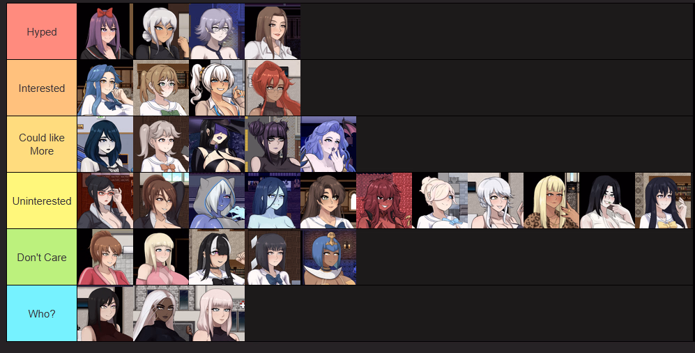 Tiered mine based on how excited I am for each characters new content/how much I liked their existing content/how confident I am in future content for them.