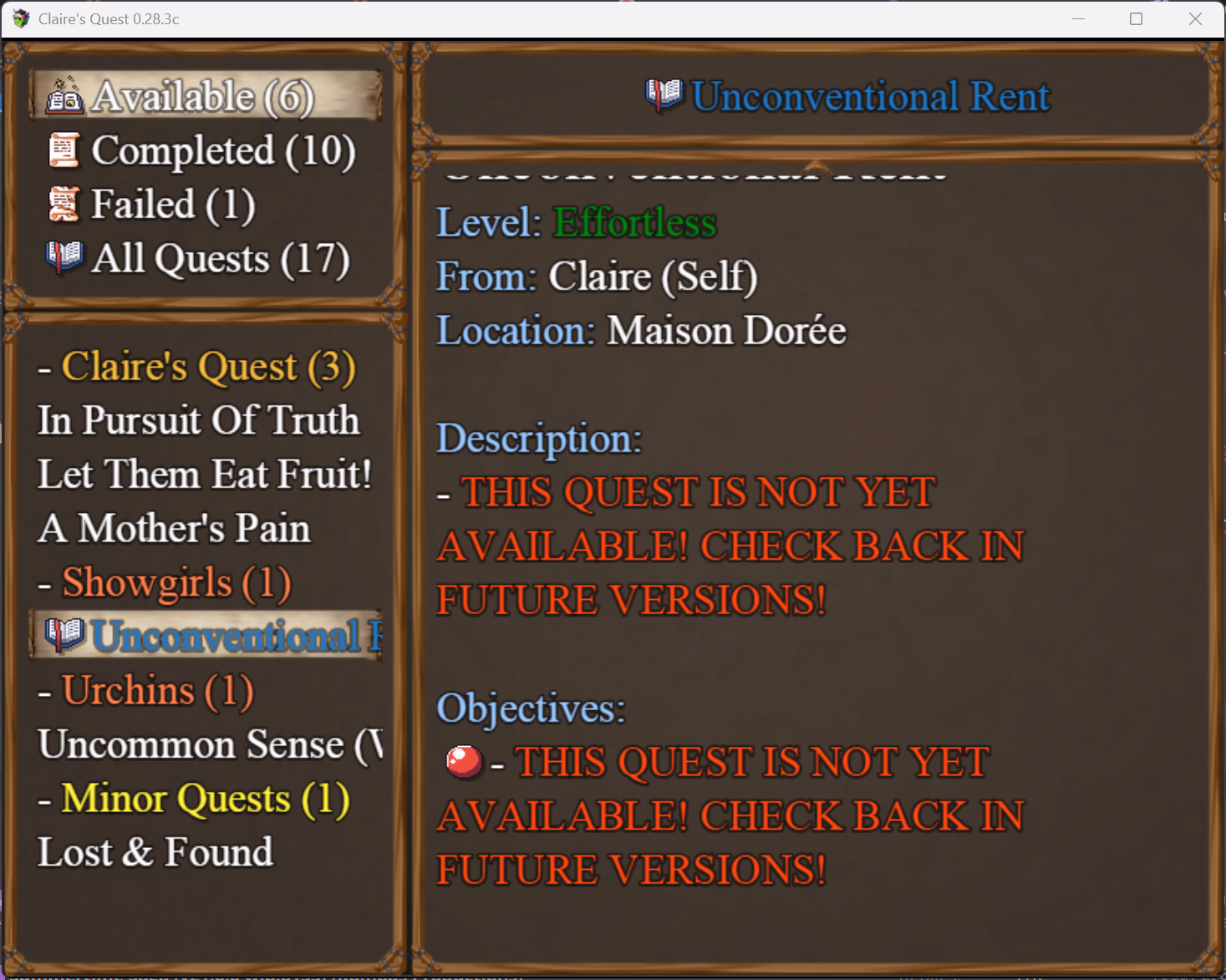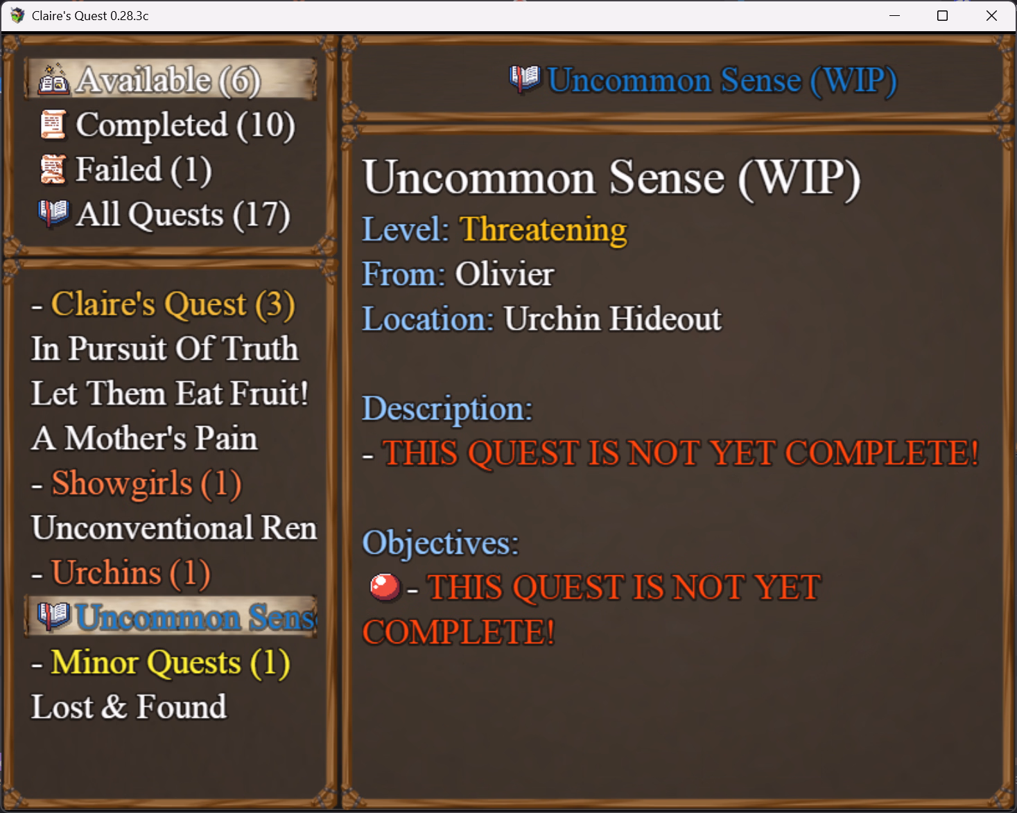 So this version of the game is "The Collector's Edition" but then why both Showgirl and Urchins Quest-lines WIP? Someone please explain this to meThe 'standard' version of Claire's Quest, ie. the Patreon Version, or the 'Black Edition', includes the Urchins Questline and shotacon content, and related sidequests - but not the Showgirls Questline in Valos.