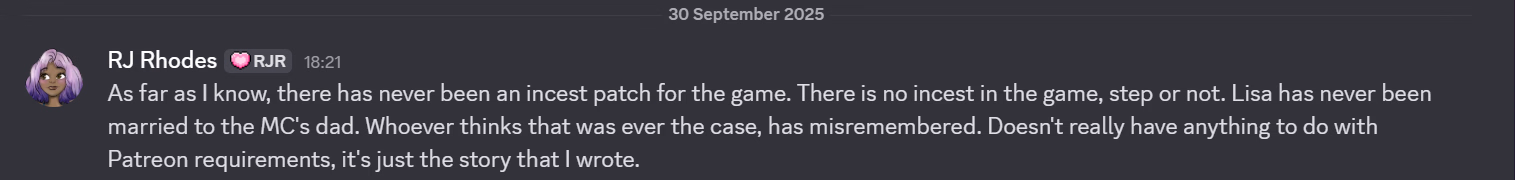 See and that makes no sense. I know that Rj has done a few rewrites over the years, but it is what it is. I remember, and apparently a few others remember that Lisa was married to the MC's dad. I'll concede my point, as I'm old and my memory can be faulty af.