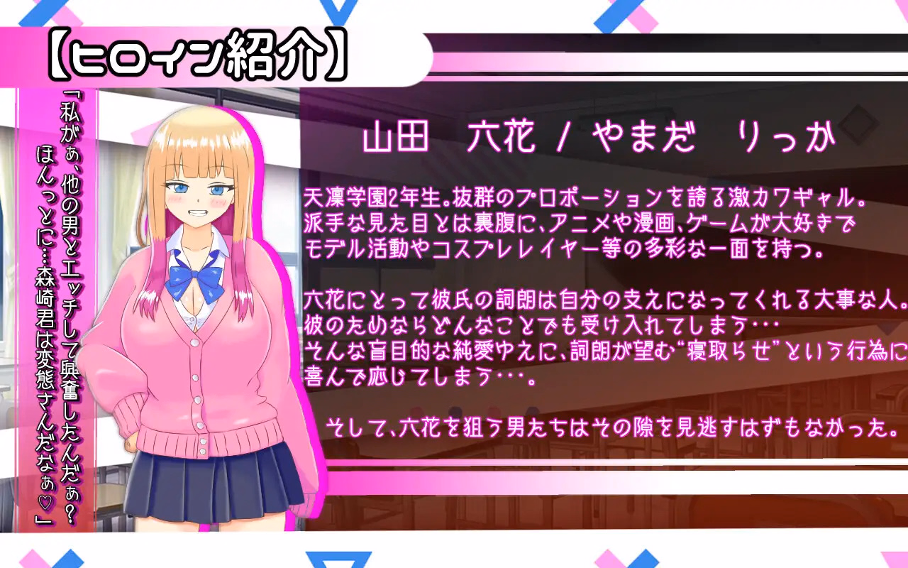 Thanks for the reply, yes I gave the pin because I like this style of game, I just thought there was a lack of communication between the couple, but I also haven't played much, I only unlocked one story from another couple. The comments talking about NTR, from what I saw on the game's page, are about Cynthia not really communicating much to the MC about some times she slept with other guys in two routes, from what I saw: the athlete route and the gyaru couple route, where she acts quite strangely, but I haven't gotten to that part yet to give my opinion.