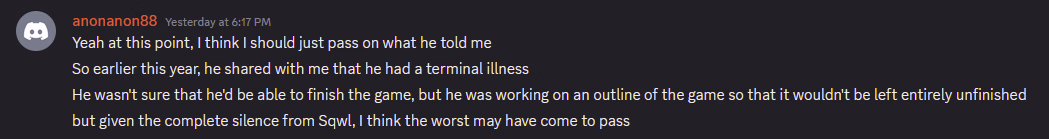 For me at least, this VN went from really high interest to mild interest to almost no interest at all. I don't even think I ever got around to finishing the last update because it just seemed like more of the same. I almost think that this isn't the proper medium for this dev. He might be better of writing a novel instead of making an AVN.