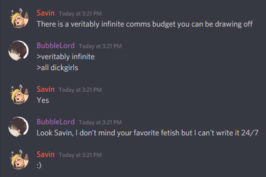 Is that an actual thing???*(Insert that one screenshot of a writer complaining that the internal commission board is nothing but dickgirls, to which Savin smugly mocks them.)*