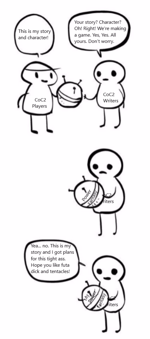 Where is this growth in CoC II? I know the meme answer is "It'S nOT a PoWEr fAnTaSy!111!" but being serious for a moment, Savin himself seems to know this on some level. His constant tweaking of the combat system, him saying how if he ever makes another game, it's going to be a visual novel with a story focus. He knows he bit off way more than he can chew.
