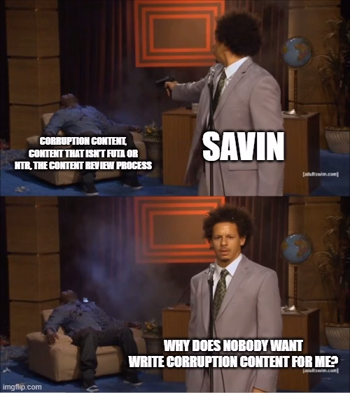 Savin probably: "Ok guys we need corruption content any takers? Great! Love the enthusiasm but we need it to be all futa and cuckold stuff. Wait what do you mean you're not into that? Where are you all going?"