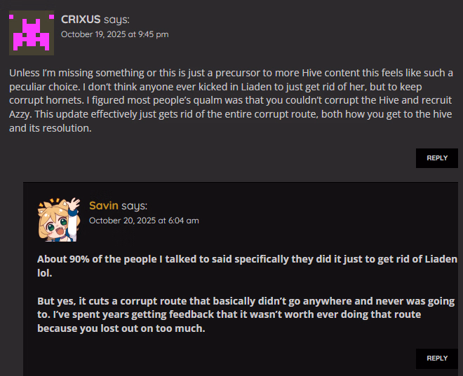 Yeah, there's an opportunity cost to every development and writing decision. Can't eat the cake and keep it afterwards.That's a good compromise, but it also limits what you can do as a writer, because then you have to involve the multitude. You can't just ignore them.They are there, which is why no one wants to tackle them once they create that option.They just leave it because you've ultimately limited yourself to a bunch of nameless faces.And one character to lead them, which is why kinu is "feature complete" despite the fact there's a whole lot there.