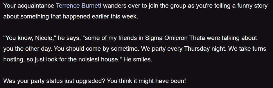 I think I have broken the game when i acquired too much popularity on the 3rd Quad party, which is the same day the chair announced the Greek House and the start of the rush week. This is the dialogue i got: