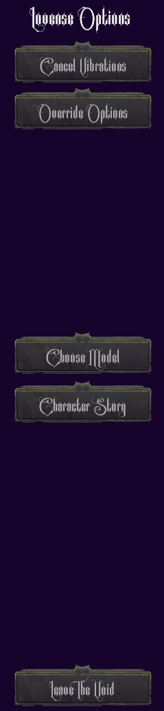 I can cancel vibrations and override options of my... Lovense? OOOOOHHHH, you can use a Lovense thingy with this game!!! Silly me! I guess because I couldn't connect anything, those buttons also do nothing, but who knows, perhaps by randomly clicking stop vibrations, I am messing up a random camgirl's show or even a loving couple's hardcore BDSM play. In the middle we have Choose Model, which shows an empty frame with another button saying "No Model Selected". Well, uh, I was expecting the "choose model" to let me choose a model? Maybe they are hiding because they are shy? Maybe my overriding of options scared them away? I may never know, cults often kick me out before the first session is over.