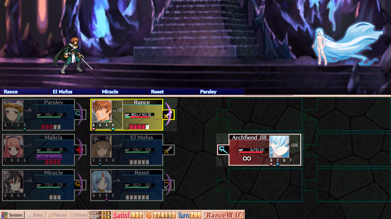 Funnily enough, and I've just noticed this litteraly minutes ago, but if you do the character clear of Natori and clear her in part 1 by defeating Orochi, she also keeps being tagged as important character (and I assume with Fuuka the same happens too), and you have no way to dismiss her at all on part 2 as well. Not that I don't like her, on the contrary, her character is extremely useful, but it's still pretty funny for that to happen. With that in mind, in a roster of 30, I already have 6 (Rance duh, Suzume, El Mofus, Natori, Bloody Angel and Bezeleye) that I can't mix (or at least mix as the 2nd unit).