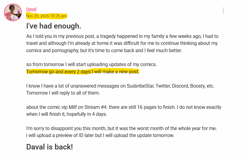 That is exactly what is happening, he started missing scheduled updates and communicating less with SUBS on SS and Discord, making all kind of excuses, and then he dropped the BALL when DAVAL said that he finally got his house built and that was taking most of his time, and was back on track (NOT). He is not the same DAVAL from a few years back when he would post updates every 2 to 3 days. See below for his last communication on SS, on 11/25 he said he would post an update on the 11/26 and every two days after that.... well, its 12/1 and all we got was the 11/26 update and again ghosted his SUBS.I think Daval is someone who needed money to achieve certain goals, perhaps a house or something else, and when he achieved his goal he no longer cared about his work, and I think he might stop releasing anything. This is just a guess.
