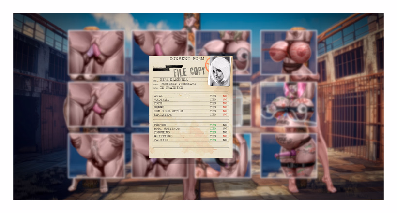 Other things that can be customized here are the duration and partners. Blindfold determines the appearance of partners - it protects Kira from seeing how her clients really look (ugly bastards, old men etc.). And the gag drastically shortens all events to just a couple of lines, since Kira can’t talk - people finish faster.