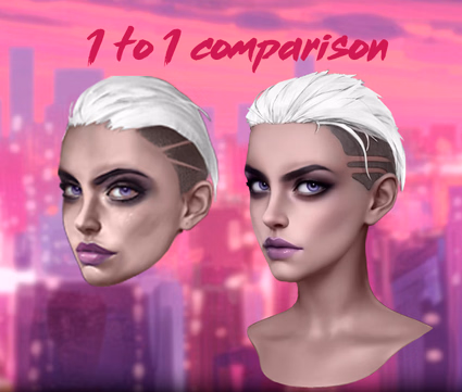 Face 1 is the closest one to her current artwork, I just painted over her current face, the goal here was to just upgrade her textures, her skin, and add in more details. I also did my best to fix the glaring imperfections of her current art - unrealistic jawline and disproportionate size of her eyes, but, by all means, it is the upgraded version of her current face.