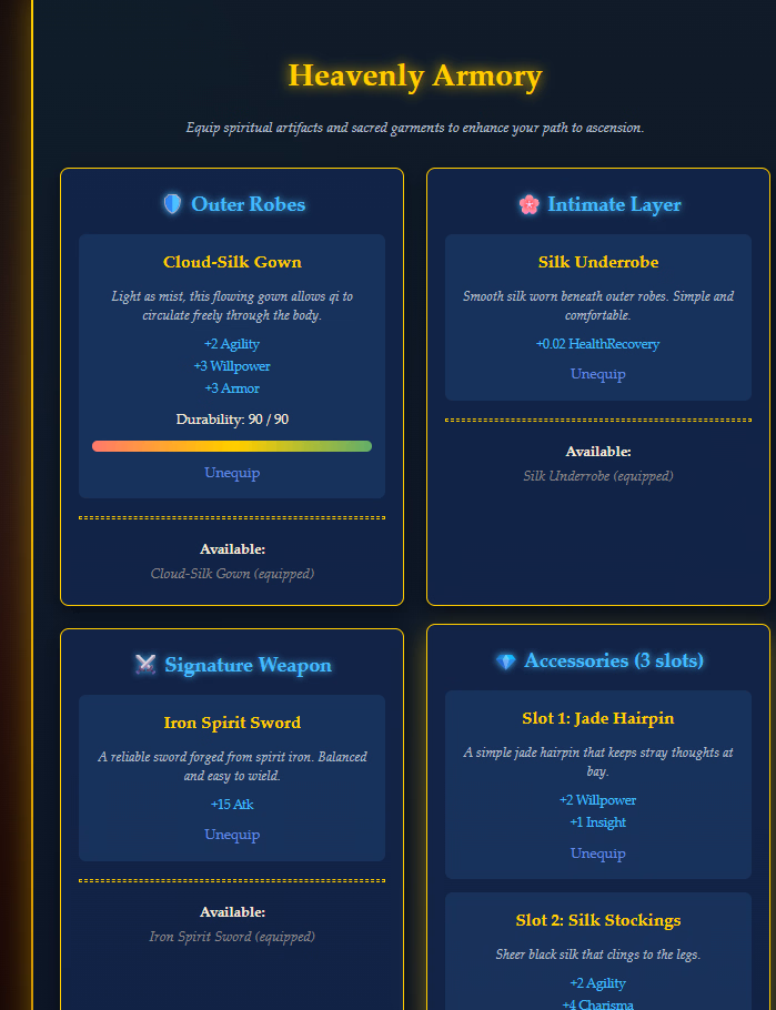 Xianxia RPG Stat-building, branching paths, combat system, destiny modifiers, NPC relationships, and a Breakthrough system. Planned 4 different world regions.
