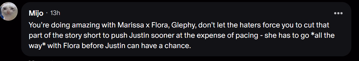 You’re doing amazing with Marissa x Flora, Glephy, don’t let the haters force you to cut that part of the story short to push Justin sooner at the expense of pacing - she has to go *all the way* with Flora before Justin can have a chance.