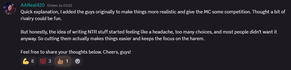 The developer himself said in his DISCORD that originally having men in the game was to make things more "realistic" and give the main character some competition, which would make the game have NTR content, and that he thought this competition would be fun. However, in the face of the negative reaction, he changed his mind, which only confirms that harem players' intuition was right, and if it weren't for the insistence on knowing about the content that would be in the game, the surprise would have been negative.