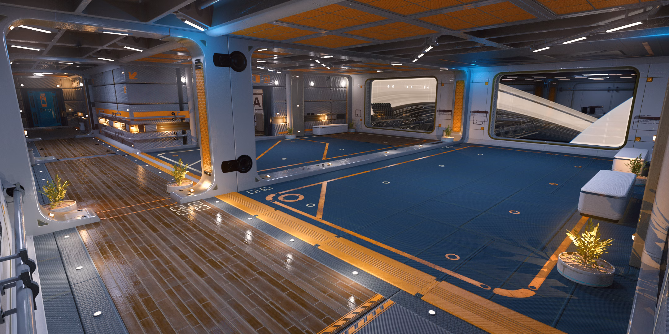 Here are a few test renders: the crew quarters where everyone will live, the jail area, the corridors of the mechanical area, and more. The command center still needs some improvement, though...